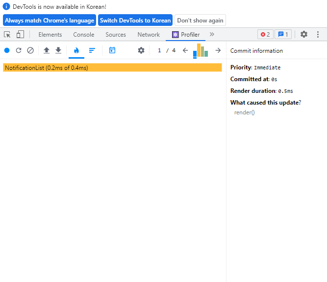 - Profiler 탭에서는 component 들이 랜더링되는 과정들을 기록하여 단계별로 살펴볼 수 있다.