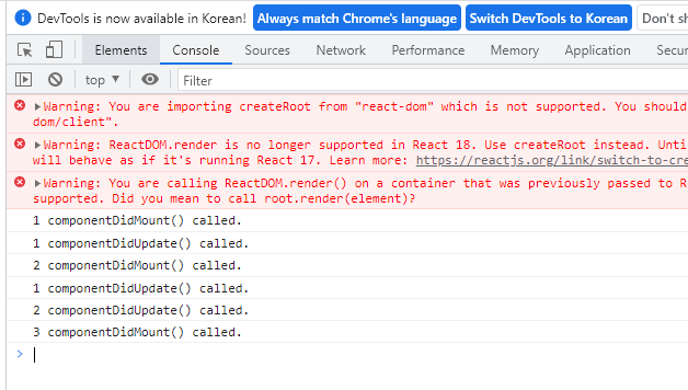 순서대로 log 가 나오는 것을 볼 수 있다. component 가 mount 될 때와 update 될 때의 log 가 출력된다.