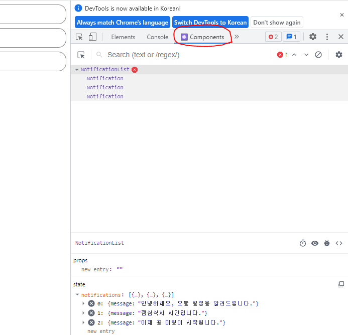 - 각 Component 를 누르면 props 와 state 확인이 가능하다. 에러가 뜨는 건 왜 그런지 모르겠으니깐 흐린눈 해야지